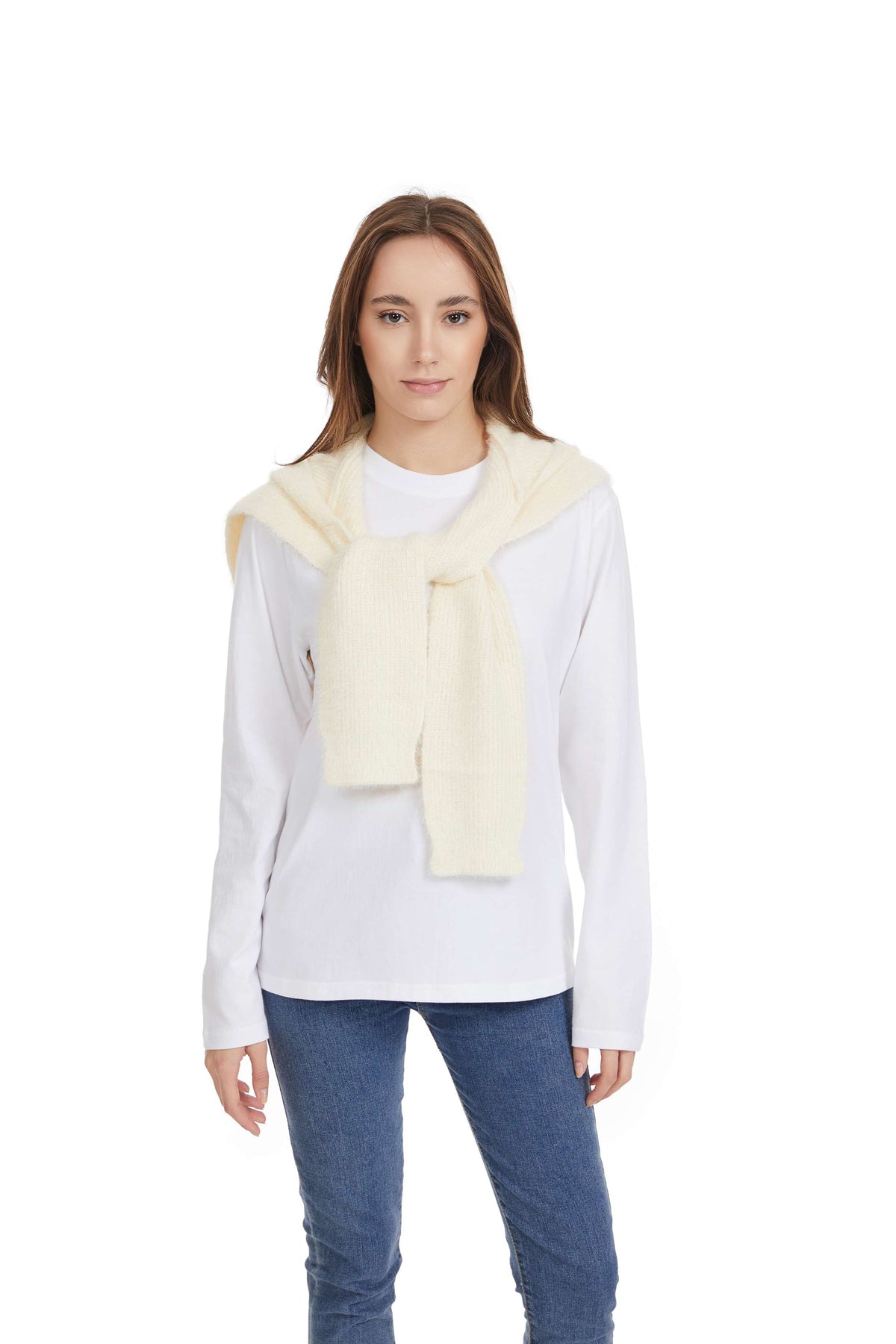 Stay stylish and warm with this unique hooded faux sweater, designed to provide the perfect balance of comfort and versatility. Featuring a soft off-white knit fabric, this piece drapes effortlessly over your shoulders, creating a layered look without the bulk of a full sweater. The attached hood adds a casual, cozy touch, making it ideal for chilly days or layering over your favorite long-sleeve tee. Pair it with jeans and boots for a relaxed yet chic outfit.