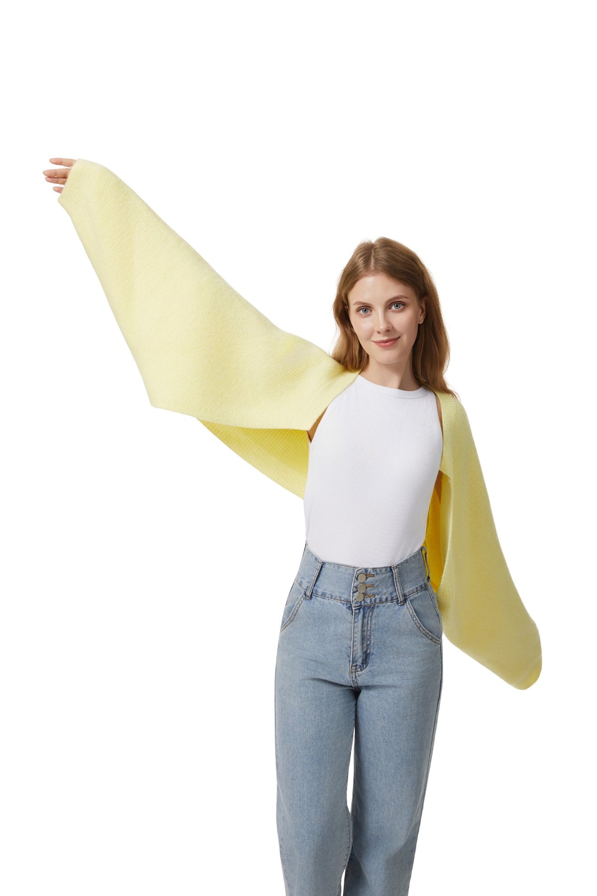 This vibrant yellow cropped cardigan delivers contemporary style with a flattering shortened silhouette. Perfect for pairing with high-waisted bottoms, it adds a sophisticated pop of color to any wardrobe.