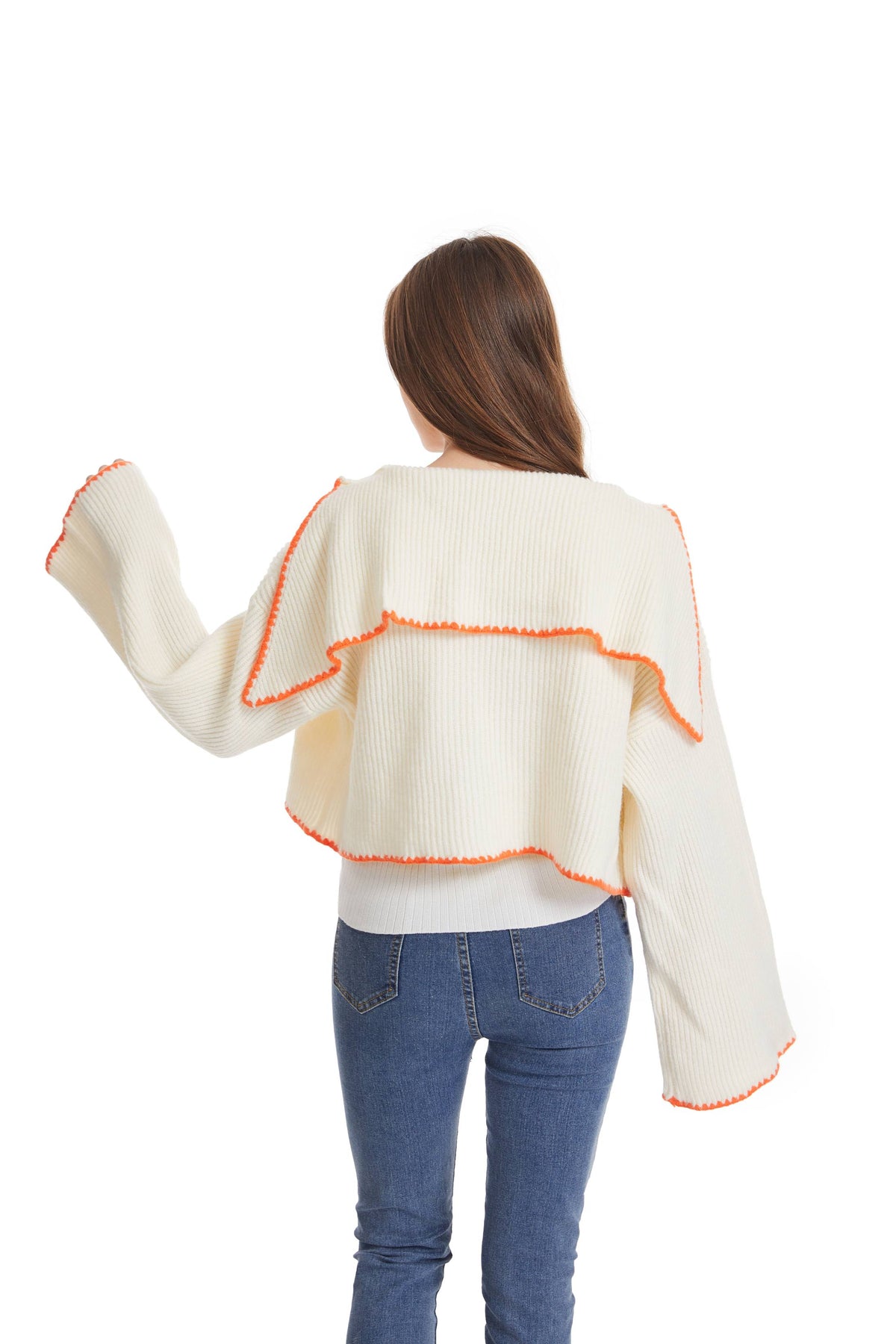 Elevate your wardrobe with this stylish cropped cardigan featuring an artisanal whipstitch detail along the edges. Crafted from soft, ribbed knit fabric, it offers a cozy yet lightweight feel, perfect for layering. The relaxed silhouette, dropped shoulders, and flared sleeves provide a modern, effortless look. Designed in an ivory hue, this versatile piece pairs beautifully with casual jeans or over a chic dress. Ideal for any season, this cardigan is both fashionable and functional.